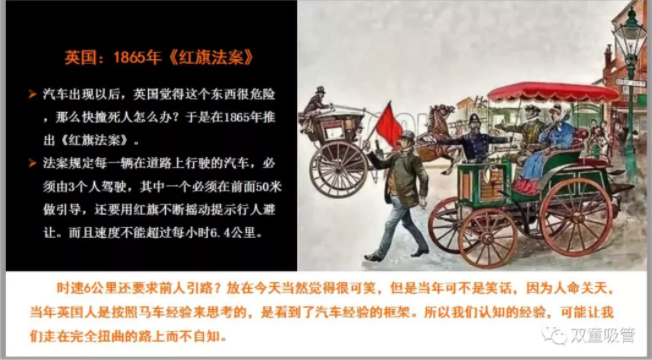 實(shí)際上,這就是“經(jīng)驗”在作祟。我們現代人之所以覺(jué)得《紅旗法案》很可笑,是建立在我們對如今汽車(chē)的認知經(jīng)驗上。而當時(shí)的英國人則是建立在對當時(shí)盛行的馬車(chē)的認知經(jīng)驗上。