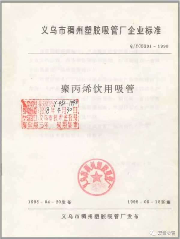 98版 Q/YCSX01-1998《聚丙烯飲用吸管》企業(yè)標準