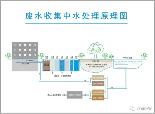 2020年年初,“雙童”二期新廠(chǎng)房投入使用,廢水收集中水回用系統在原來(lái)“雙童”一期廠(chǎng)房的基礎上進(jìn)行了大量的優(yōu)化和提升,讓員工日常生活中所產(chǎn)生的廢水不僅得到循環(huán)利用,而且還消滅了企業(yè)的廢水排放和污染,同時(shí)還為企業(yè)節省了大量水費支出! “雙童”二期新廠(chǎng)區:廢水收集中水處理原理圖 “雙童”二期新廠(chǎng)區節能降耗設計圖