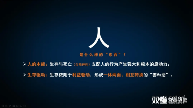 在課程分享伊始,樓老師首先通過(guò)人性的角度,讓同學(xué)們認知“人是一個(gè)什么樣的東西”?
