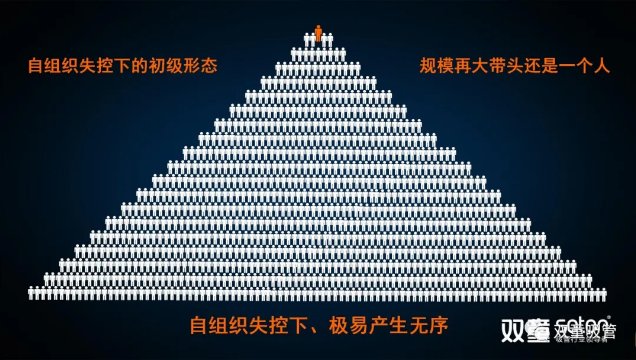 但由于自組織是基于血緣化形成的自然組織,在規模上有自然的邊界,個(gè)體數量一般局限在30人以下,超過(guò)30人的自組織就會(huì )陷入混亂、組織就會(huì )失控,從而導致組織管理工作的無(wú)序和失衡。