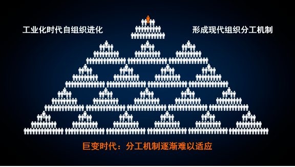 數字化環(huán)境下“人”的改變導致信息獲取的方式持續改變,信息的扁平化傳播讓每個(gè)人都能獲得更有效率的信息獲取方式,信息的非對稱(chēng)環(huán)境幾乎被消滅,組織成員的心智急速提升,認知方式劇烈改變,原有的工業(yè)時(shí)代分工管理機制逐漸難以被成員所接受,經(jīng)歷百年完善的分工管理機制在數字化環(huán)境下逐漸難以適應巨變環(huán)境帶來(lái)的持續挑戰。