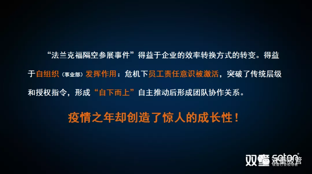 隨后,樓老師通過(guò)“法蘭克福隔空參展事件”,讓大家深刻意識到這種機制催生的巨大活力?!半p童”第三事業(yè)部在2020年2月疫情危機下,自主經(jīng)營(yíng)的員工責任意識被激活,在眾多不利環(huán)境下突破了傳統層級和授權指令,實(shí)現“自下而上”推動(dòng)后形成了緊密的團隊協(xié)作關(guān)系。在眼看參展無(wú)望的絕境下竭盡所能,核心成員通過(guò)創(chuàng )新方式和遠程視頻控的方式聘請德國慕尼黑工業(yè)大學(xué)的留學(xué)生全程參展,從而獲得了五年以來(lái)最好的參展效果,在疫情之年取得了驚人的成長(cháng)性。