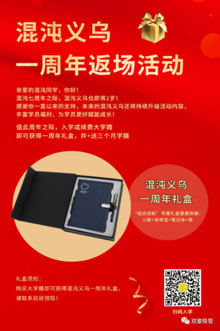 在混沌義烏即將成立一周年之際,混沌義烏也做了一個(gè)返場(chǎng)活動(dòng),如果大家有意向加入混沌,歡迎掃碼了解更多咨詢(xún)。