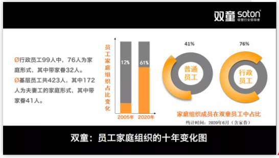 2004年9月開(kāi)始,雙童就明確把中國傳統“家文化”作為員工管理的著(zhù)力點(diǎn),鼓勵員工內部戀愛(ài),以“小家”形成“大家”。