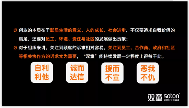 當說(shuō)起“雙童”為何要持續堅持“利他經(jīng)營(yíng)”時(shí),樓仲平答:“雙童”善待員工、善待生態(tài)、善待環(huán)境、善待他人,不是因為有錢(qián)了才良心發(fā)現才道德回饋,而是懂得“利他而利己”的邏輯關(guān)系,實(shí)際是:唯有持續對員工好,企業(yè)才會(huì )持續發(fā)展!