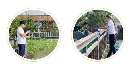 為了給大家燒烤聚餐準備鮮美的食材,10月8日一大早,天剛蒙蒙亮,樓總和李總就已經(jīng)全副武裝地出現在空中生態(tài)園的池塘前,和魚(yú)兒來(lái)了場(chǎng)“親密接觸”。