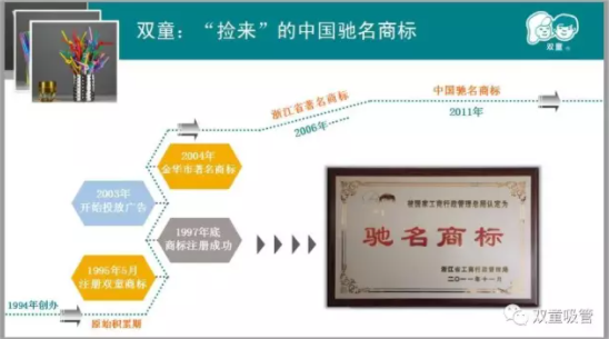 本來(lái)關(guān)于“雙童吸管”品牌塑造經(jīng)歷的博文,我會(huì )在以后創(chuàng )業(yè)經(jīng)歷的博客分享中逐漸提及,但由于前幾天(2011年10月29日)國家工商總局公布了今年新認定的378家“中國馳名商標”名單,“雙童”牌吸管位居其中,15年的創(chuàng )牌之路和所有員工的心血付出,使“雙童吸管”終于站上了中國品牌的最高榮譽(yù)殿堂。我考慮再三,決定提早對“雙童吸管”品牌塑造的部分過(guò)程故事進(jìn)行整理,并希望本文能給創(chuàng )業(yè)路上還在猶豫著(zhù)要不要做品牌的朋友帶來(lái)一些啟迪。