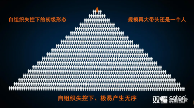 但由于自組織是基于血緣化形成的自然組織,在規模上有自然的邊界,個(gè)體數量一般局限在30人以下,超過(guò)30人的自組織就會(huì )陷入混亂、組織就會(huì )失控,從而導致組織管理工作的無(wú)序和失衡。