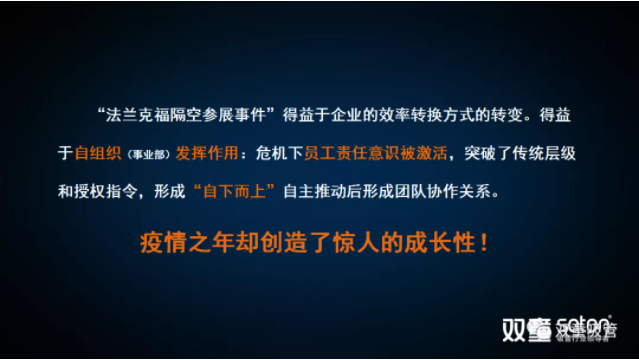 隨后,樓老師通過(guò)“法蘭克福隔空參展事件”,讓大家深刻意識到這種機制催生的巨大活力?!半p童”第三事業(yè)部在2020年2月疫情危機下,自主經(jīng)營(yíng)的員工責任意識被激活,在眾多不利環(huán)境下突破了傳統層級和授權指令,實(shí)現“自下而上”推動(dòng)后形成了緊密的團隊協(xié)作關(guān)系。在眼看參展無(wú)望的絕境下竭盡所能,核心成員通過(guò)創(chuàng )新方式和遠程視頻控的方式聘請德國慕尼黑工業(yè)大學(xué)的留學(xué)生全程參展,從而獲得了五年以來(lái)最好的參展效果,在疫情之年取得了驚人的成長(cháng)性。