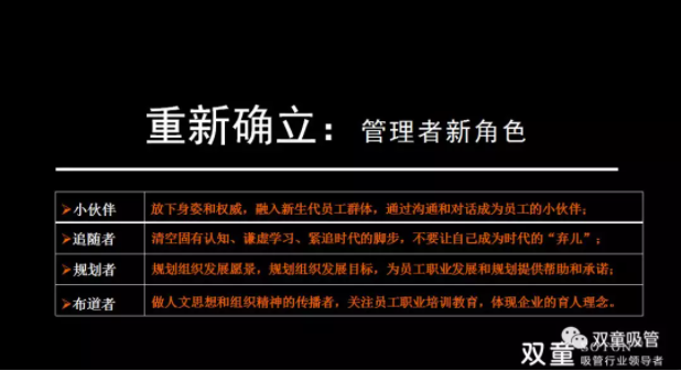 • 小伙伴:在新生代員工面前,管理者不應該再把自己塑造成“高高在上”的威嚴上級,而是應當放下姿態(tài),清空自己,和大家一起平等溝通,傾聽(tīng)員工的想法和建議,成為員工的小伙伴!