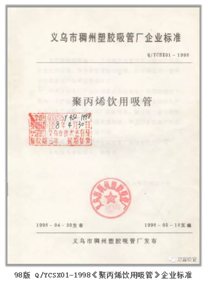 終于在1997年10月,由“雙童”前身的義烏市稠州塑膠吸管廠(chǎng)起草的《聚丙烯飲用吸管》企業(yè)標準順利通過(guò)審核,于1998年4月正式發(fā)布,成為吸管行業(yè)最早的產(chǎn)品標準。從此,“雙童”打開(kāi)了產(chǎn)品在商超場(chǎng)所的銷(xiāo)售渠道,實(shí)現了傳統家庭作坊企業(yè)向正規工廠(chǎng)的轉型。