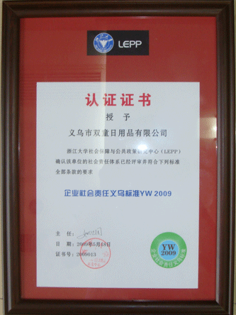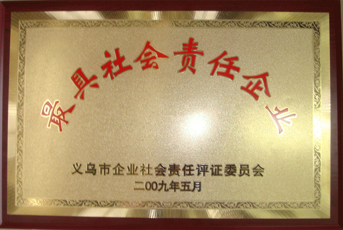 5月22日下午,義烏市總工會(huì )在北苑街道多功能廳舉行由浙江大學(xué)社會(huì )保障與公共政策研究中心(LEPP)確認的最具社會(huì )責任企業(yè)頒獎儀式,吳森民副市長(cháng)出席會(huì )議并作了重要講話(huà)。我司經(jīng)評審符合企業(yè)社會(huì )會(huì )責任義烏標準YW2009全部條款的要求,并被授予“最具社會(huì )責任企業(yè)“稱(chēng)號。