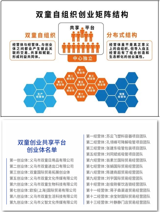 通過(guò)近五年的自組織裂變,雙童成立了八大創(chuàng )業(yè)體及十二個(gè)經(jīng)營(yíng)體,形成了自裂變、自生長(cháng)的創(chuàng )業(yè)生態(tài)。