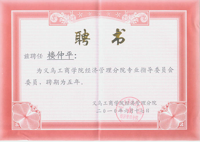 上圖:義烏工商學(xué)院授予董事長(cháng)樓仲平先生指導委員會(huì )委員聘書(shū)