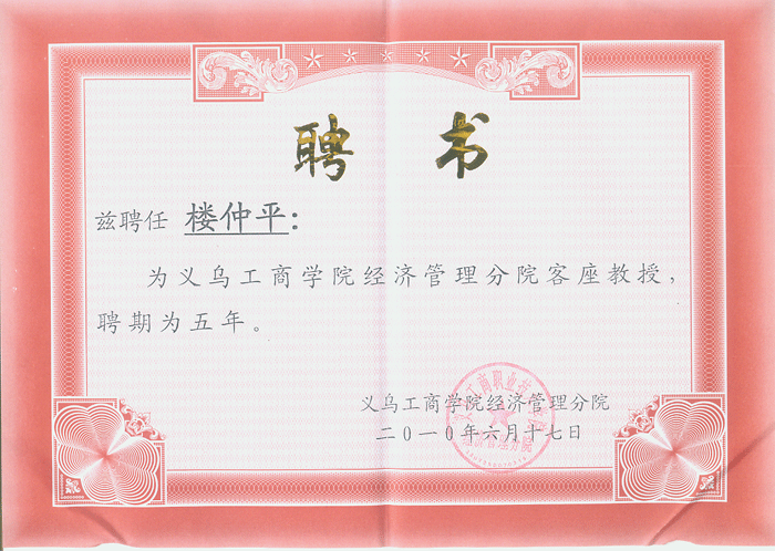 上圖:義烏工商學(xué)院授予董事長(cháng)樓仲平先生客座教授聘書(shū)