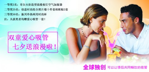浪漫七夕,有愛(ài)心更溫馨~~~也許你輕輕的點(diǎn)擊,獲得的不僅是溫馨浪漫,更多的是時(shí)尚健康。全球獨創(chuàng )專(zhuān)利新產(chǎn)品“愛(ài)心吸管”, 給浪漫的伴侶實(shí)現共享一杯,在濃濃愛(ài)意中共吐纏綿,愛(ài)心吸管,一起吸出愛(ài)的味道!