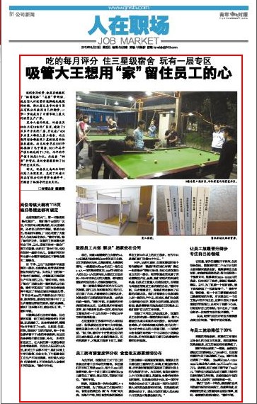 8月22日,作為浙江省四大主流平面媒體之一的《青年時(shí)報》專(zhuān)門(mén)派遣資深記者到我公司,參觀(guān)公司并采訪(fǎng)了董事長(cháng)樓仲平。次日,《青年時(shí)報》就以整整一個(gè)版面的文字介紹了我公司,并著(zhù)重描述了我公司對員工的關(guān)懷政策和生態(tài)型企業(yè)文化。以下是文章正文: