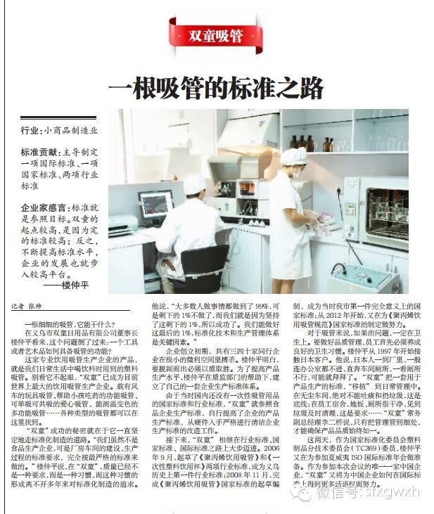接下來(lái),“雙童”相繼在行業(yè)標準、國家標準、國際標準之路上大步邁進(jìn)。2006年9月,起草了《聚丙烯飲用吸管》和《一次性塑料飲用杯》兩項行業(yè)標準,成為義烏歷史上第一件行業(yè)標準;2008年11月,完成《聚丙烯飲用吸管》國家標準的起草編制,成為當時(shí)我市第一件完全意義上的國家標準;從2012年開(kāi)始,又在為《聚丙烯飲用吸管規范》國家標準的制定做努力。