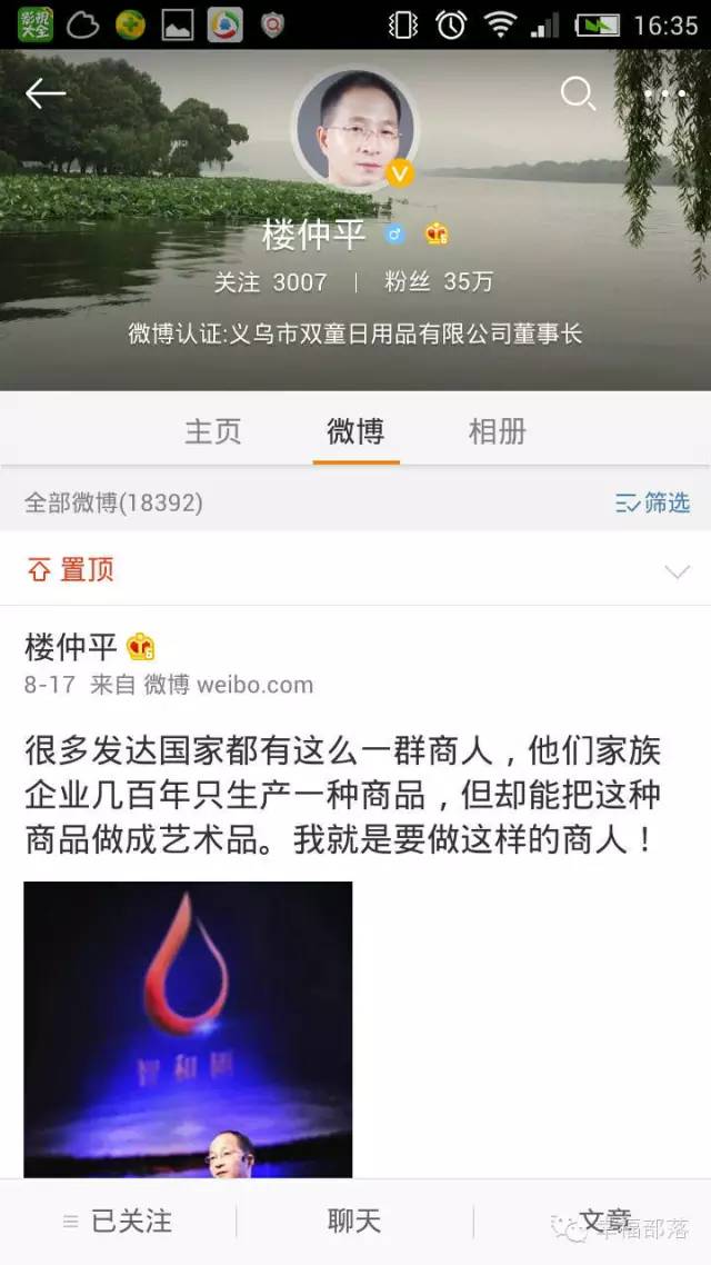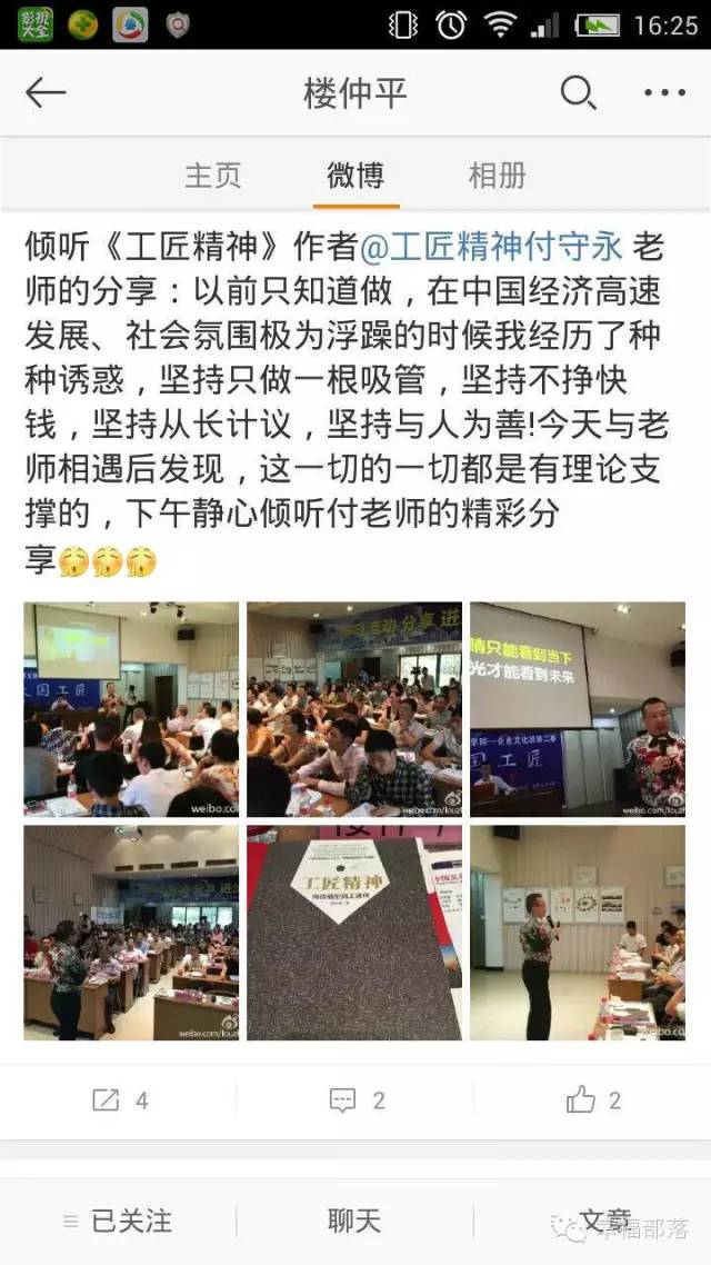 這是樓總在微博上實(shí)時(shí)對課程的感悟:很多發(fā)達國家有這么一群商人,他們家族企業(yè)幾百年只生產(chǎn)一種產(chǎn)品,但卻能把這種產(chǎn)品做成藝術(shù)品,而他自身勵志就是要做這樣的商人。