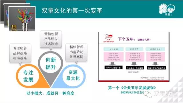 2005年9月13日,“雙童吸管”發(fā)布第一個(gè)“五年規劃”。樓仲平與開(kāi)發(fā)團隊一起,致力于思考除了喝飲料,吸管還能“干什么”?如何讓吸管“無(wú)奇不有”。于是,最近10年來(lái),“雙童吸管”逐漸放棄了低端加工和薄利多銷(xiāo),專(zhuān)注于高端市場(chǎng)的開(kāi)發(fā)。憑借細致入微、持續不斷的產(chǎn)品創(chuàng )新,企業(yè)員工人數從原來(lái)的900名減少到了現在的350名,但員工的平均生產(chǎn)能力增加了數倍,以“減法”實(shí)現了“加法”。