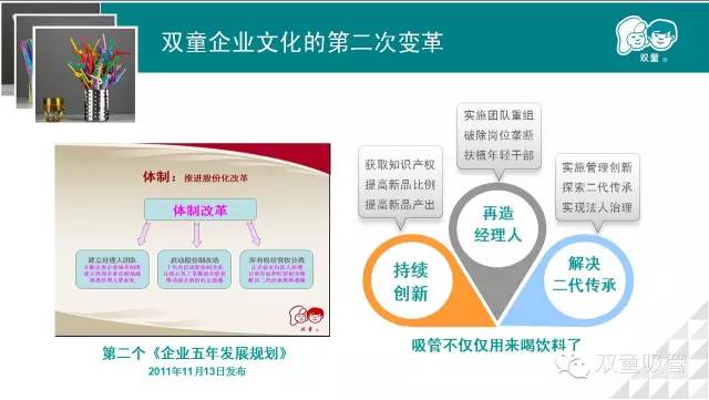2011年“雙童吸管”開(kāi)始做第二個(gè)五年規劃,通過(guò)產(chǎn)品創(chuàng )新、團隊再造、體制改革三個(gè)方面進(jìn)行發(fā)展。