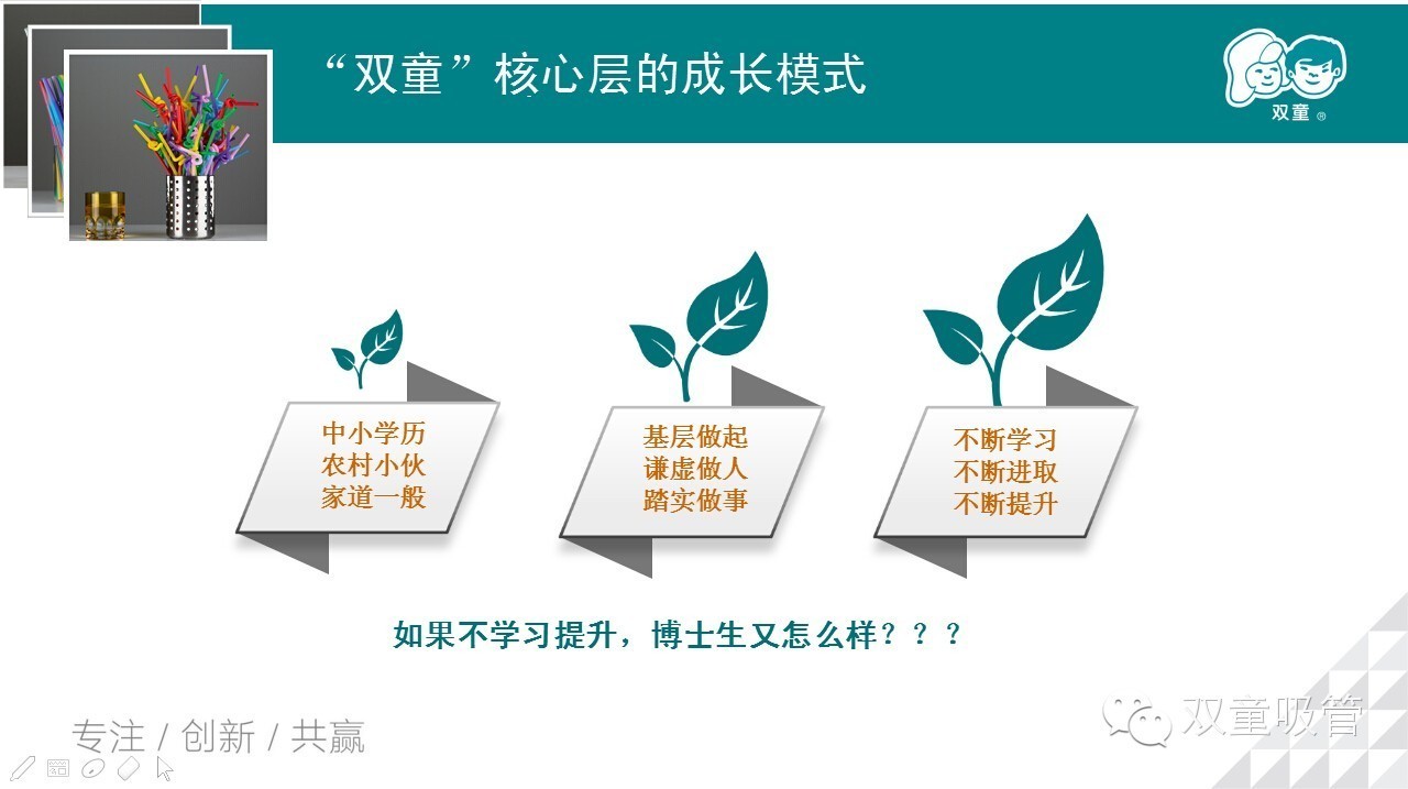而為了增強說(shuō)服力,當家人還舉了不少雙童人自己的例子。從普普通通的一個(gè)員工開(kāi)始做起,一步步提升進(jìn)步,穩扎穩打,在雙童實(shí)現了事業(yè)家庭的夢(mèng)想的人不在少數!樓總說(shuō),我們的李總、廠(chǎng)長(cháng)、車(chē)間主任等等,都是我們身邊最鮮活的例子!他們不僅在雙童升職加薪,還在雙童泡妞生娃呢!