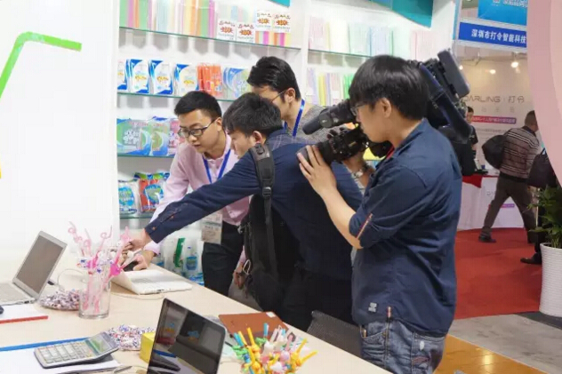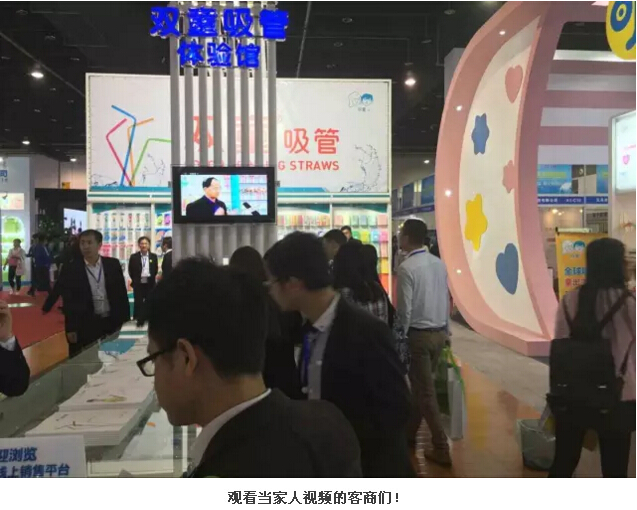 經(jīng)過(guò)雙童經(jīng)過(guò)的客商基本都會(huì )留下腳步。原來(lái)是雙童展位的正中央掛著(zhù)一臺大尺寸的電視機,不間斷的滾動(dòng)播放當家人接受的各類(lèi)節目采訪(fǎng),以及各類(lèi)媒體對雙童吸管進(jìn)行報道的視頻!看來(lái)咱們當家人的魅力還真是大呀!