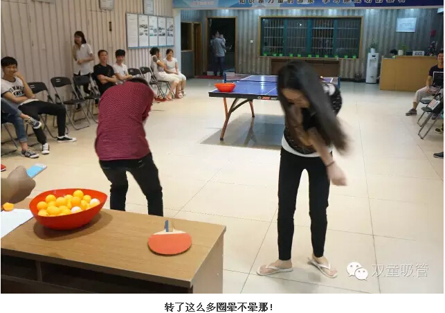 別急!先來(lái)玩玩小游戲。瞧!捏鼻子 轉大象、定點(diǎn)投乒乓球等游戲層出不窮。大伙運球之前必須先轉上5圈,哎呀!還沒(méi)拿起球拍運球,就暈在乒乓球桌上了!逗得在場(chǎng)觀(guān)眾們都捧腹大笑!