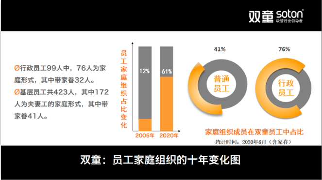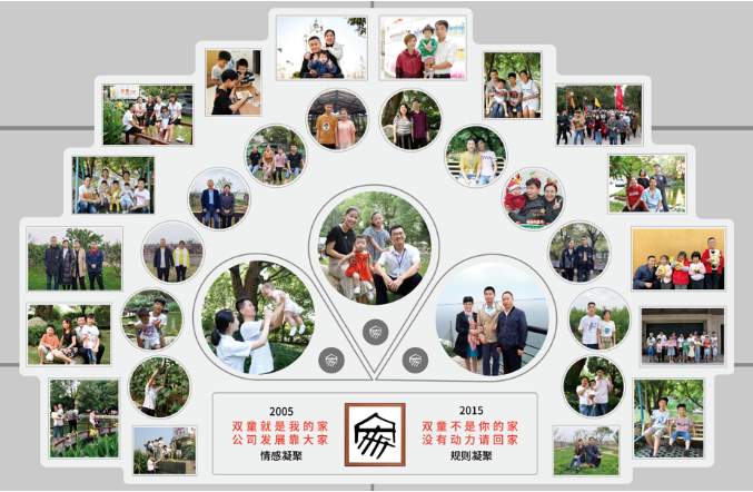 雙童早期團隊的很多成員,都是在公司內部找到自己的人生伴侶,生兒育女、組成一個(gè)個(gè)小家庭,逐漸形成雙童特色的“家文化”。在這樣的企業(yè)文化下,很多員工早已把公司當成了“第二個(gè)家”。