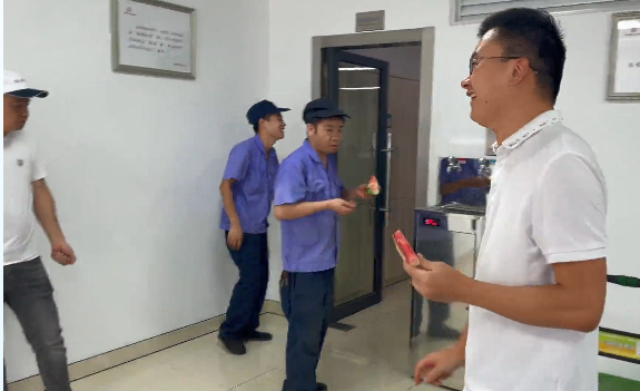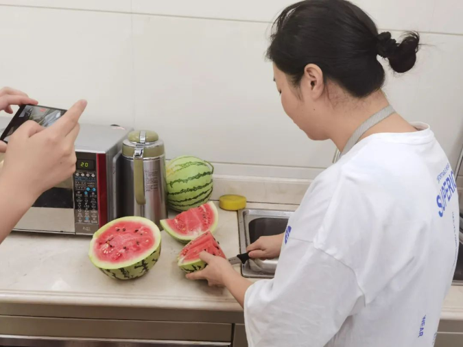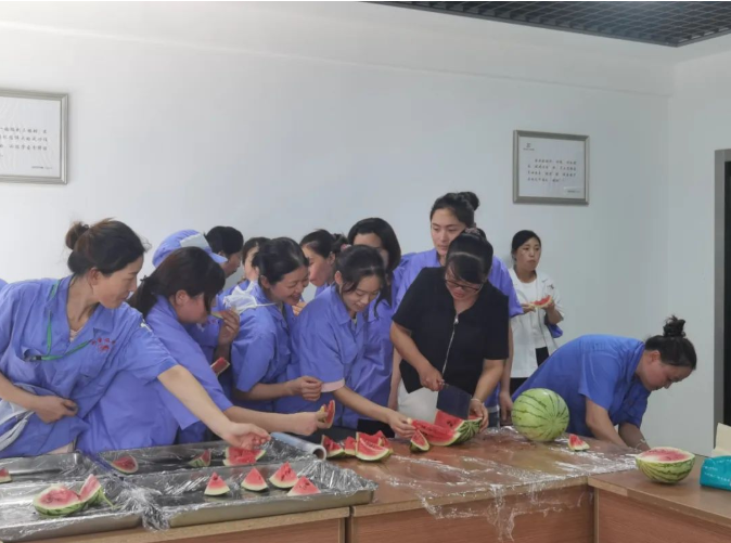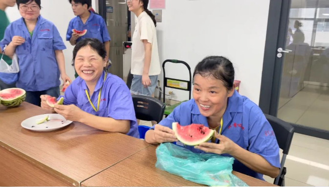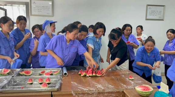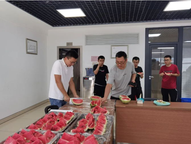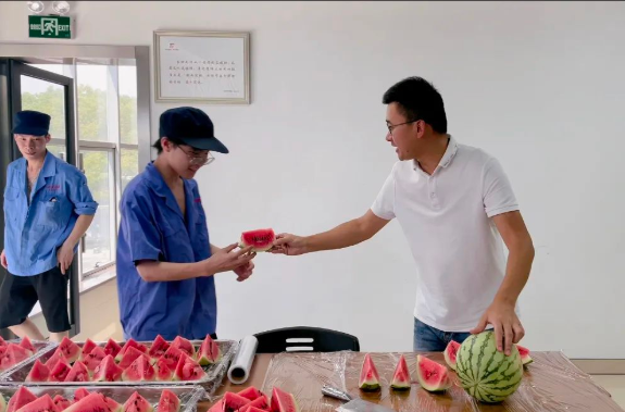 車(chē)間一線(xiàn)員工自然也不能落下,“雙童”總經(jīng)理李二橋親自上陣“殺”瓜,他還給大家透露,在他的安徽老家也有一片瓜田,論切西瓜,他可是專(zhuān)業(yè)的