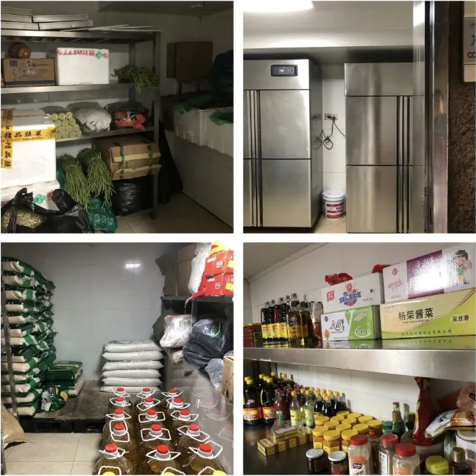 其中采購入庫的魚(yú)、肉等易腐爛變質(zhì)的葷菜必須分區妥善保存在冰箱中,新鮮蔬菜與米、面等主食原料分開(kāi)存放;除了常規的食材分開(kāi)存放外,食用油、大米、面粉、面條、調味料等食材消耗品,進(jìn)行分類(lèi)、分架、隔墻、離地存放。