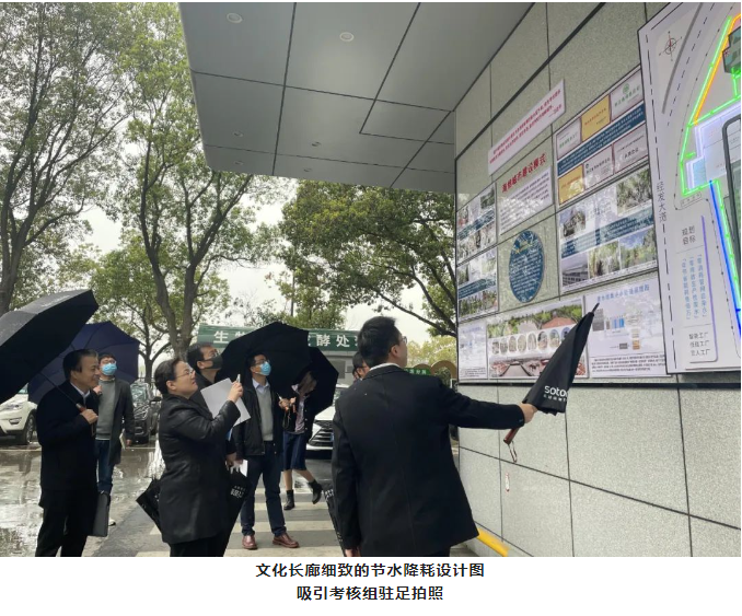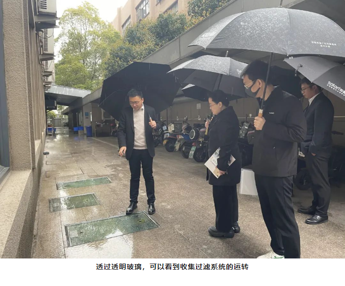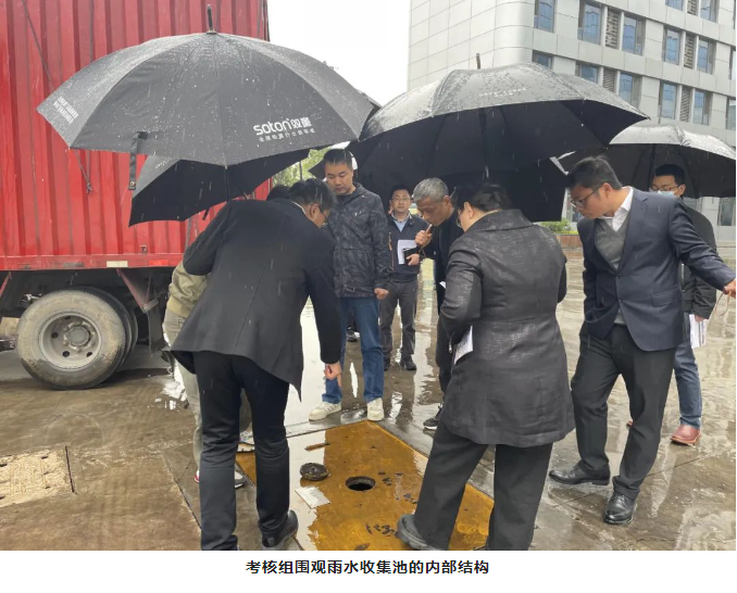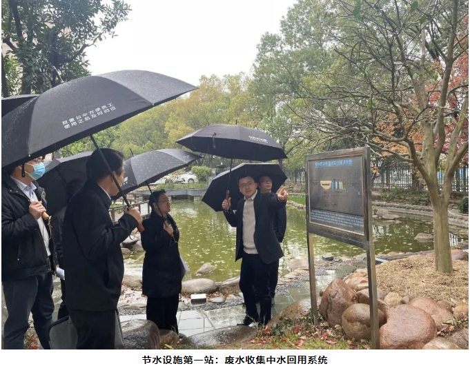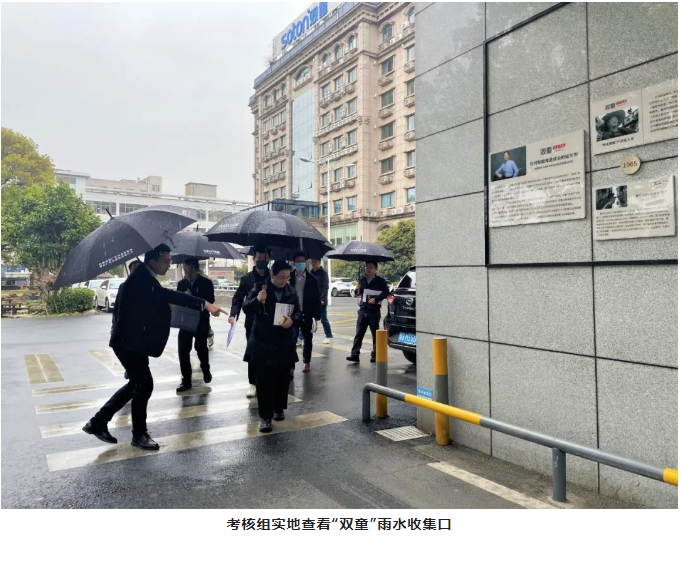 緊接著(zhù),考核組一行參觀(guān)“雙童”的雨水收集系統。在“雙童”不到40畝的廠(chǎng)區內用雨水代替90%的自來(lái)水!這都得益于廠(chǎng)區內的雨水收集循環(huán)利用系統。正巧,調研當日義烏下起了小雨,方便了考核組直接觀(guān)察雨水被收集的過(guò)程。