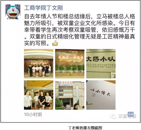 據丁老師自己介紹,他之前來(lái)過(guò)一次“雙童”,當家人樓總帶著(zhù)他參觀(guān)了企業(yè)后,對我們的精細化管理深表贊賞,離開(kāi)了之后也一直念念不忘。就連學(xué)生的開(kāi)學(xué)第一天,他就號召大家關(guān)注“雙童”的官方微信,時(shí)刻關(guān)注我們的動(dòng)態(tài)向我們學(xué)習。(吸管妞肺腑之言:這樣的班主任,請給我來(lái)一打?。?/span>