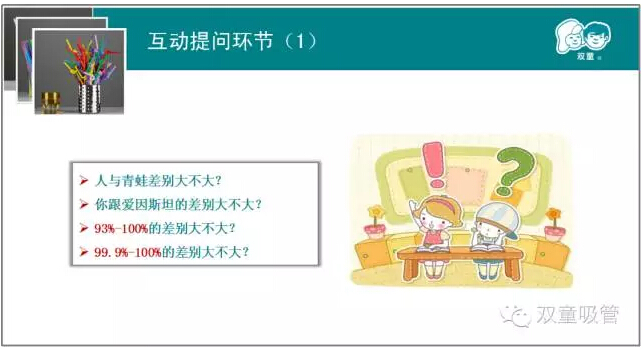 這不,一開(kāi)場(chǎng),互動(dòng)環(huán)節就停不下來(lái)啦!“人與青蛙的差別大不大?你與愛(ài)因斯坦的差別大不大?99.9%—100%的差別大不大?”如此有趣的互動(dòng)問(wèn)題童鞋們也是爭相恐后的回答呢!你沒(méi)說(shuō)到的我補充,我說(shuō)到的你來(lái)延展?,F場(chǎng)的學(xué)習氛圍可真是十分融洽呢!