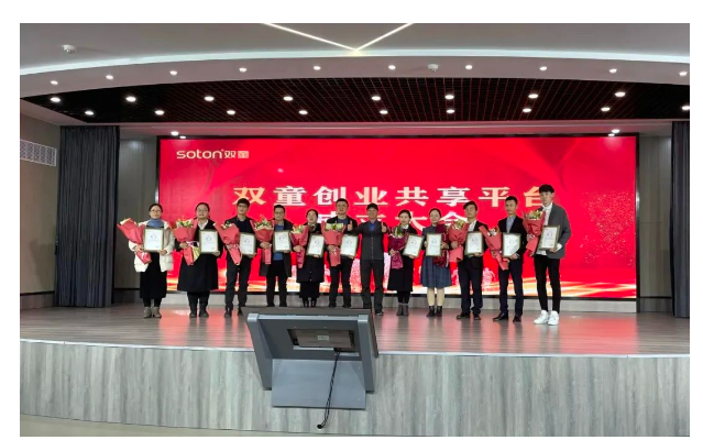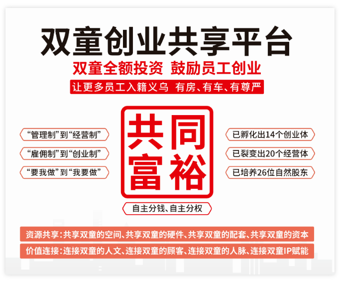目前已有30多位員工在義烏及周邊區域買(mǎi)房,40個(gè)家庭在義烏落籍成為義烏人,14位員工成為創(chuàng )業(yè)體總經(jīng)理,產(chǎn)生了20位雙童創(chuàng )業(yè)共享平臺股東。