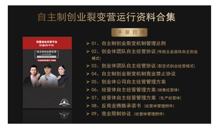 3、交付自主制創(chuàng )業(yè)裂變模式的各項規則、文本、合同等書(shū)面資料