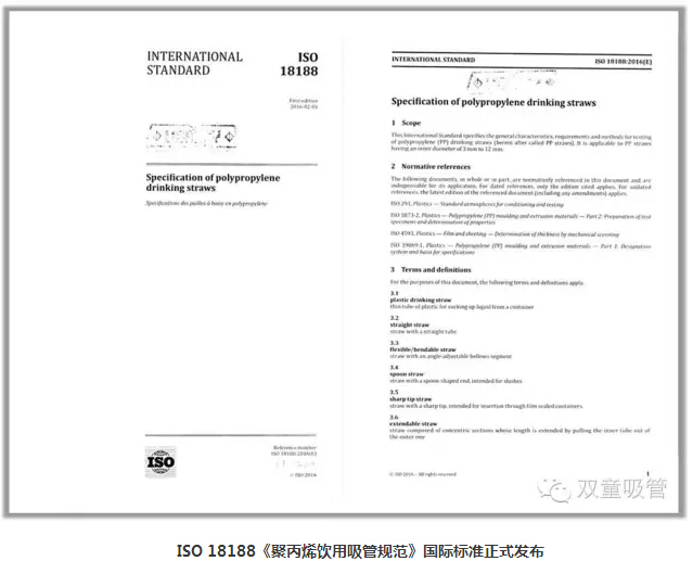 2008年7月,雙童在完成《聚丙烯飲用吸管》行業(yè)標準、國家標準的起草編制任務(wù)后,向ISO標準化管理組織申請了國際標準的起草制定任務(wù)。四年后,中國、泰國、瑞典、法國、南非五國組成的《聚丙烯飲用吸管規范》國際標準起草委員會(huì )成立。