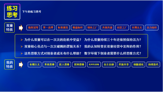 一千個(gè)人眼中有一千個(gè)哈姆雷特,36位同學(xué)來(lái)自各行各業(yè),帶著(zhù)自己的經(jīng)驗認知,以及“開(kāi)門(mén)”思維,一齊就多個(gè)“雙童”案例的開(kāi)放式問(wèn)題進(jìn)行總結歸納,并探討各自企業(yè)復制經(jīng)驗的可能性。