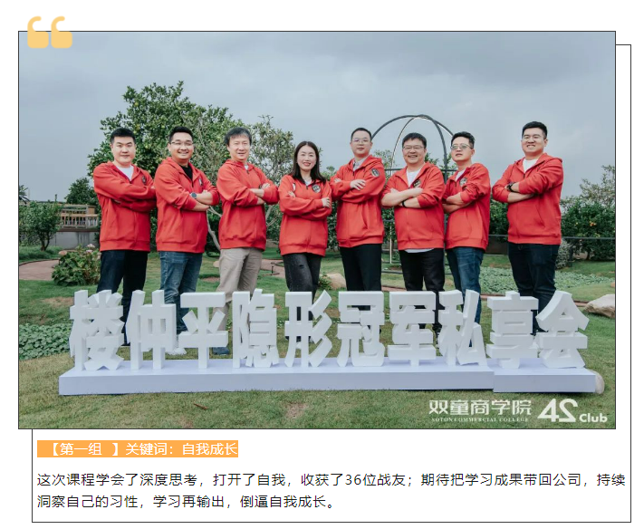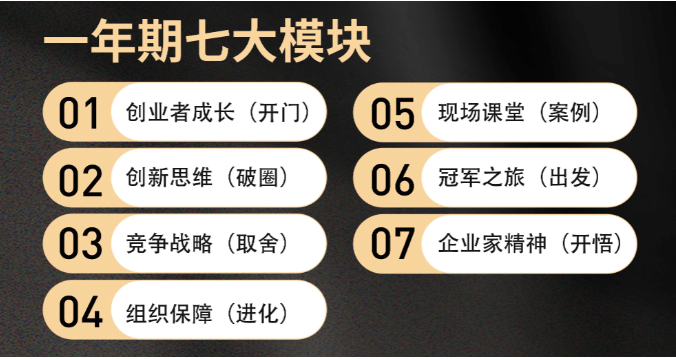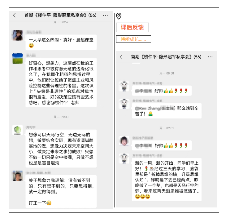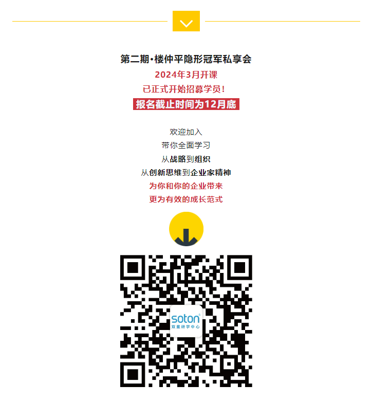 目前,樓仲平隱形冠軍私享會(huì )第一期已結束第一模塊的學(xué)習,接下來(lái)繼續開(kāi)展6大模塊,主題分別為“破圈”、“取舍”、“進(jìn)化”、“案例”、“出發(fā)”、“開(kāi)悟”,一起期待吧!