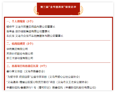 “雙童”還在今年7月獲得金華市慈善領(lǐng)域政府最高獎,這都展示了“雙童”在慈善領(lǐng)域的擔當與努力,為高質(zhì)量高水平建設“世界小商品之都”、奮力譜寫(xiě)現代化義烏嶄新篇章,貢獻出一份慈善力量。