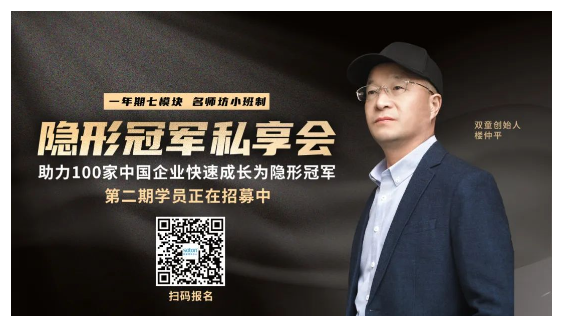 助力中國100家高潛力細分行業(yè)企業(yè)成為隱形冠軍,是樓仲平老師此生最大的愿望,為此雙童商學(xué)院聯(lián)合42Club共同發(fā)起了以樓仲平名字為背書(shū)的「樓仲平隱形冠軍私享會(huì )」。