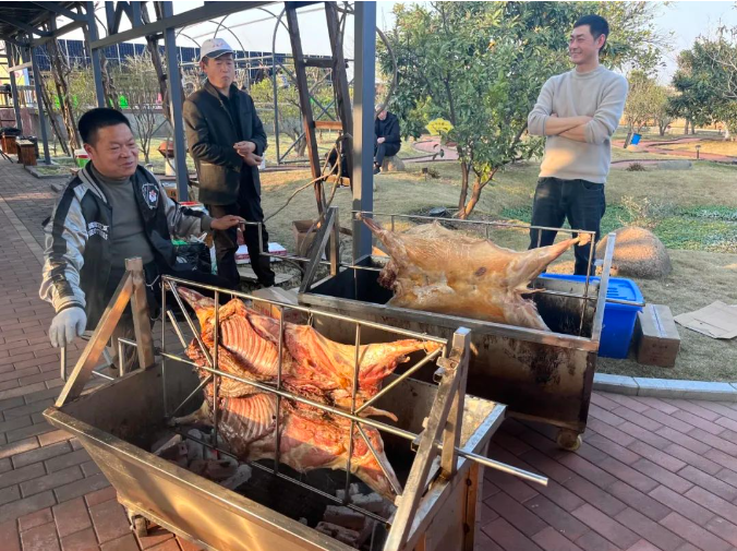 經(jīng)過(guò)一下午的翻烤,此時(shí)的烤全羊已經(jīng)相當誘人了!旁邊又有可愛(ài)的同事支起了燒烤攤,烤串、烤腸、烤玉米…手法嫻熟,看著(zhù)很專(zhuān)業(yè)呢!