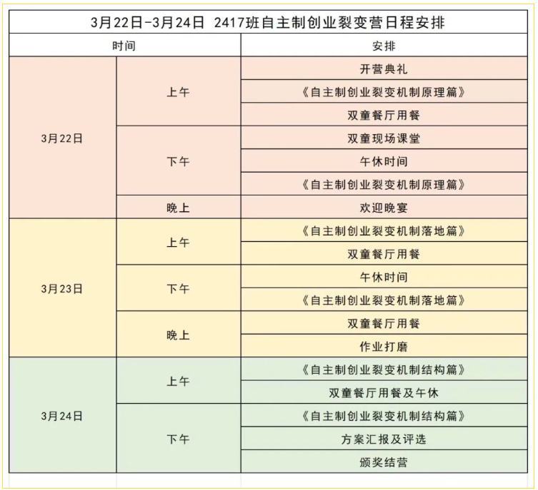 您好!現確定您已報名由雙童商學(xué)院舉辦的 《自主制創(chuàng )業(yè)裂變營(yíng)》課程,預祝您在此次3天2夜的課程中學(xué)有所獲、學(xué)有所用,為企業(yè)設計一套讓優(yōu)秀人才為自己干的機制,通過(guò)組織機制推動(dòng)員工從“要我做”到 “我要做”。