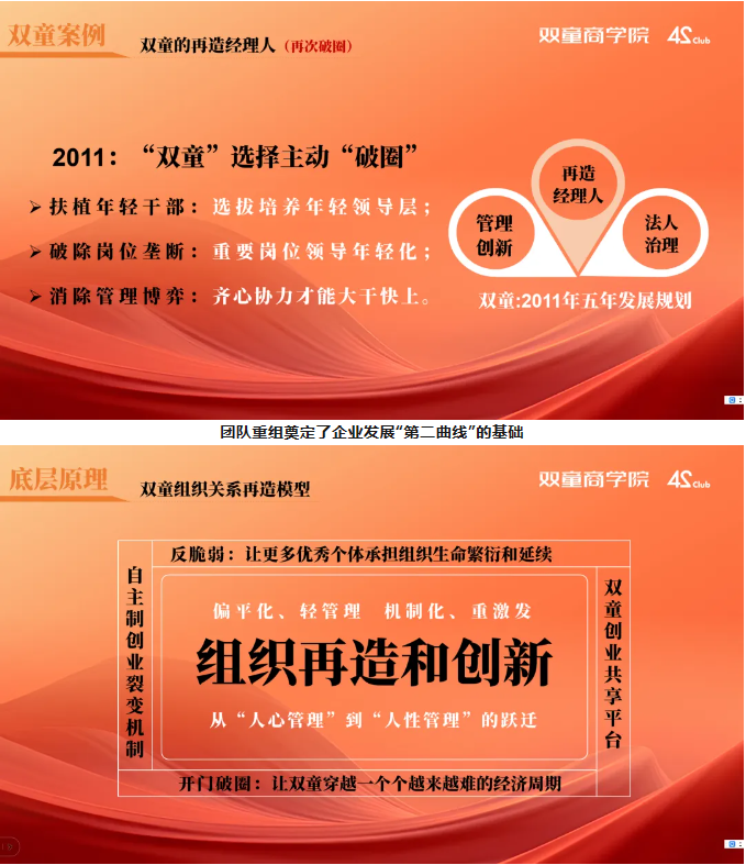 2011年,“雙童”選擇主動(dòng)“破圈”,再造經(jīng)理人,催生出新生代管理層;2017年之后,“雙童”再次破圈,逐漸從固化中走出,徹底打開(kāi)組織邊界,推動(dòng)搭建創(chuàng )業(yè)共享平臺,第二曲線(xiàn)發(fā)展迅速,5年間裂變出15家創(chuàng )業(yè)公司。