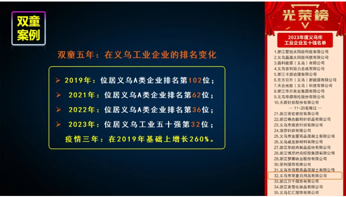 • 2023年,平臺整體增長(cháng)35.24%;平臺稅收增長(cháng)23.30%,成功登榜“納稅千萬(wàn)元以上工業(yè)企業(yè)”和“義烏市工業(yè)企業(yè)五十強”!
