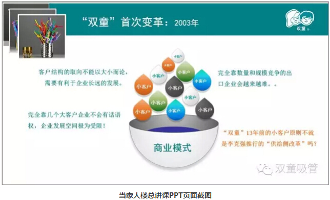 通過(guò)我們“雙童”的“小客戶(hù)原則”,吸管妞想讓大家明白,經(jīng)營(yíng)目的是實(shí)現企業(yè)自身最大的商業(yè)價(jià)值。在企業(yè)自身的發(fā)展過(guò)程中,一定要注意不能被大客戶(hù)所控制,要有企業(yè)自身的話(huà)語(yǔ)權和經(jīng)營(yíng)控制權!