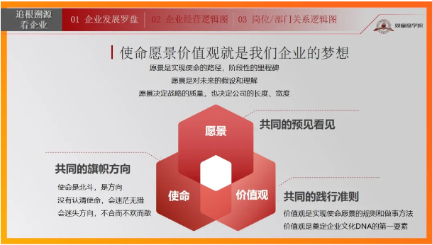 “追根溯源看企業(yè)”旨在讓參訓學(xué)員明確自己企業(yè)發(fā)展目標、夢(mèng)想,并推動(dòng)目標的實(shí)現;正確認知企業(yè)經(jīng)營(yíng)現狀,明確企業(yè)盈利的關(guān)鍵點(diǎn)和卡點(diǎn);掌握科學(xué)合理地劃分部門(mén)與崗位的依據和方法。
