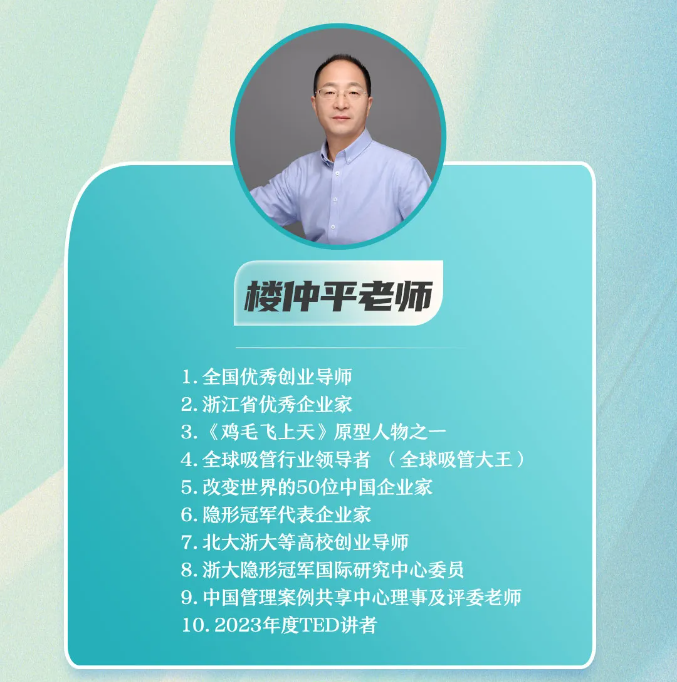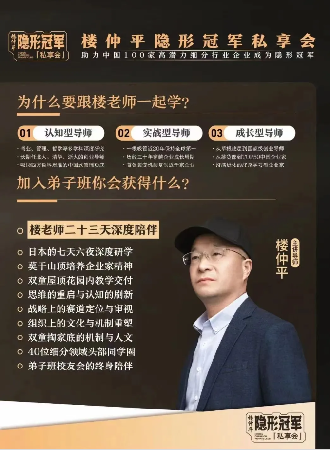 如果你是創(chuàng )業(yè)者、學(xué)習者、思想者,希望在經(jīng)營(yíng)領(lǐng)域有自己的思考和洞察,那么《樓仲平·隱形冠軍私享會(huì )》就是為你量身定制,今年最后一期招生,一班只招40位同學(xué),名額所剩不多,抓緊機會(huì )哦!
