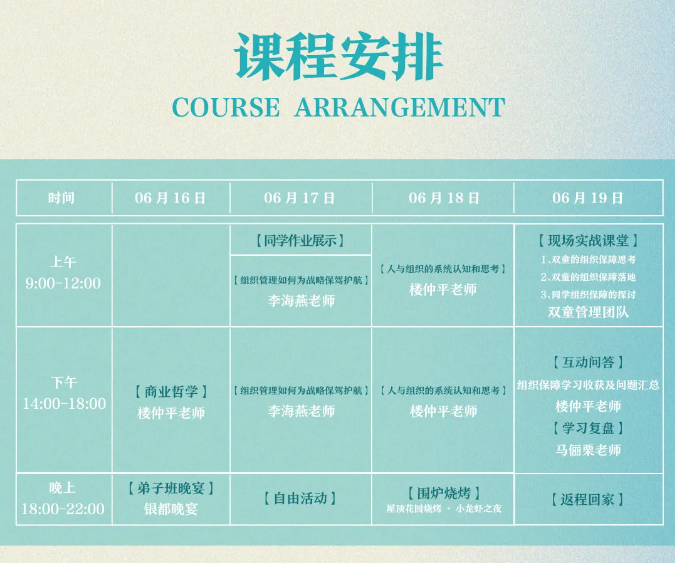 4天3夜的【組織保障】課程,學(xué)員們將在樓仲平老師與李海燕老師的帶領(lǐng)下,深入探討組織保障的核心認知與最佳實(shí)踐。第4天課程則由雙童管理團隊共同完成交付,還將帶領(lǐng)學(xué)員將走入雙童的組織實(shí)戰課堂,完成對組織的認知升級,讓組織為自己的企業(yè)保駕護航,創(chuàng )造可持續的商業(yè)價(jià)值!